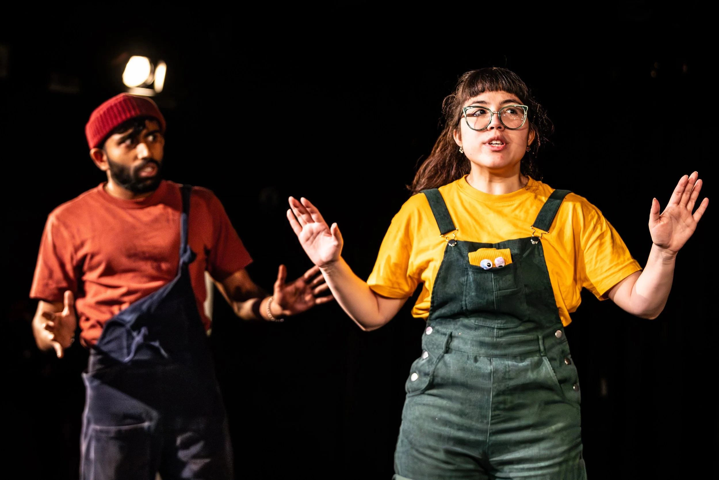 Gavin Joseph (left) and me (Emi Del Bene) in “Sorry We’re Beans” at the Soho Theatre, December 2023